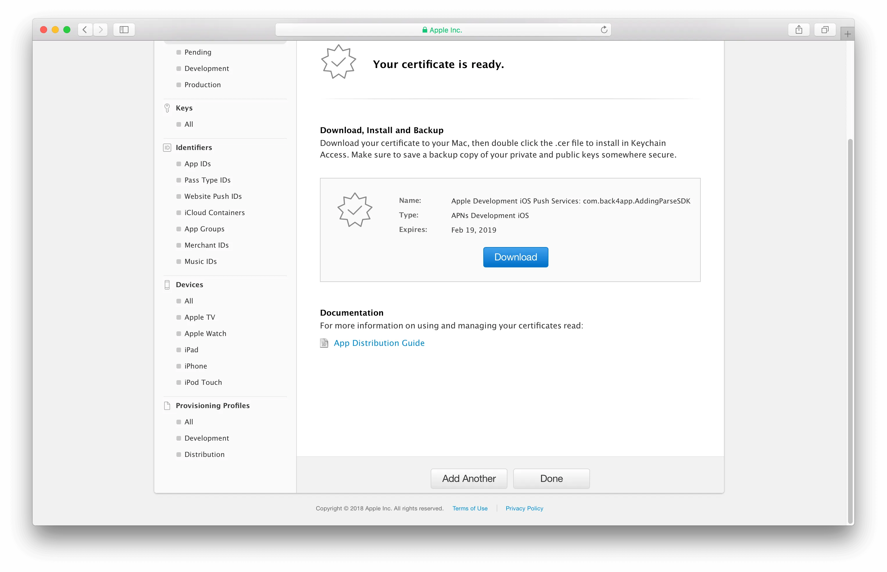 send ios push notifications using back4app objective c introduction this section explains how you can send push notifications using cloud code through back4app this is how it will look like at any time, you can access the complete project built with this tutorial at our https //github com/templates back4app/ios install sdk to complete this quickstart, you need https //developer apple com/xcode/ an app created at back4app follow the https //www back4app com/docs/get started/new parse app to learn how to create a parse app at back4app an ios app connected to back4app note follow the https //www back4app com/docs/ios/parse swift sdk to create an xcode project connected to back4app a paid apple developer account 1 create your push certificates in the apple developer center pay attention to the steps below because you need to get them right in the exact order if pushes are not being received there isn’t much we can do to debug besides going over the steps again go to the target and go to capabilities click on push notifications then turn push notifications on this creates your app id and sets your entitlements 2\ go to the https //developer apple com/ and login to your account 3\ click on certificates, identifiers & profiles 4\ in the certificates section hit the plus sign choose to create a apple push notification certificate for sandboxes 5\ pick your app id that matches the app id used in your current xcode project 6\ now you will be asked for a certificate signing request or csr you will generate your csr from your mac computer 7\ on your mac computer open your keychain access 8\ next, request a certificate from a certificate authority 9\ pick your user email, then make sure you save your certificate to disk save it on a folder on your desktop called pushcerts 10\ go back to the apple developer center upload your csr and hit continue 11\ download your development apn certificate into the same folder called pushcerts call it apn dev 12\ let’s start the process over this time we will create production push certificates you need both for testing and release select apple push notification service ssl (sanbox & production) 13\ upload your csr your previously created and hit continue 14\ download your production apn certificate into the same folder called pushcerts call it apn prod 15\ at this point you should have 3 files in your pushcerts folder double click on your apn prod and your apn dev files to add them to your keychain 16\ open the keychain and find the files in the keychain click on each on and hit export you will want to export them as a p12 file into your pushcerts folder name the development one cert dev pushcertificates p12 and name the production cert as prod pushcertificate p12 17\ it will ask you add a password to your exported file just leave it blank you will have to enter your master key to sign the certificate though, and thats fine 18\ now that you have added your p12 files your folder should look like this if you have all these files in your folder you can go on to step 2 if you don’t have any of these files go back to the beginning and figure out where you missed a step 2 adding your p12 certificates to back4app you’re almost done aren’t you excited? go to https //www back4app com/ , log in, find your app and click on ios push notification ios push notification 2\ upload the dev cert and the prod cert and hit send for each 3\ after you’ve uploaded both certificates your screen should look like this 3 setting up your xcode project to receive push notifications open your project’s appdelegate m file to create a push installation object add the usernotifications framework at the top of the file https //github com/mpc20001/ios objc push back4app/blob/master/addingparsesdkobjc/appdelegate m#l11 \#import \<usernotifications/usernotifications h> 2\ add the code below inside of the didfinishlaunchingwithoptions function, and make sure it is before ‘return true’ statement https //github com/mpc20001/ios objc push back4app/blob/master/addingparsesdkobjc/appdelegate m#l27 \[self registerforremotenotifications]; 3\ add the following code snippets to your appdelegate m file below the didfinishlaunchingwithoptions function this code will issue a request for push notifications permissions when the app first launches make sure to say yes to this request or your app will not be able to receive pushes it will also handle the resulting token when the request is approved and save it as an installation object on back4app https //github com/mpc20001/ios objc push back4app/blob/master/addingparsesdkobjc/appdelegate m#l31 l55 \ (void)registerforremotenotifications { unusernotificationcenter center = \[unusernotificationcenter currentnotificationcenter]; \[center requestauthorizationwithoptions (unauthorizationoptionsound | unauthorizationoptionalert | unauthorizationoptionbadge | unauthorizationoptioncarplay) completionhandler ^(bool granted, nserror nullable error){ if(!error){ dispatch async(dispatch get main queue(), ^{ \[\[uiapplication sharedapplication] registerforremotenotifications]; }); }else{ nslog(@"%@",error description); } }]; } \ (void)application (uiapplication )application didregisterforremotenotificationswithdevicetoken (nsdata )devicetoken { // store the devicetoken in the current installation and save it to parse pfinstallation currentinstallation = \[pfinstallation currentinstallation]; \[currentinstallation setdevicetokenfromdata\ devicetoken];; \[currentinstallation saveinbackgroundwithblock ^(bool succeeded, nserror error) { if (!error) { nslog(@"installation saved!!!"); }else{ nslog(@"installation save failed %@",error debugdescription); } }]; } 4\ test it by running your app you should see this in your simulator 5\ from here on out you must use a physical device, an iphone or ipad push notifications do not work with the xcode simulator if you do not have a physical device you cannot go any further in the tutorial once you have your physical device atta